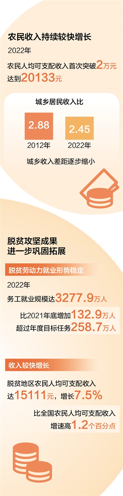 增加農民收入是“三農”工作的中心任務。2022年,農民人均可支配收入首次突破2萬元,城鄉居民收入比從2012年的2.88下降到2022年的2.45,城鄉收入差距逐步縮小。“也要看到,當前農民收入增速有所放緩,增收動能有所減弱。必須高度重視,拿出長短結合、務實管用的硬措施,拓寬農民增收致富渠道?!敝醒朕r辦專職副主任、農業農村部黨組成員吳宏耀說。對此,今年中央一號文件在穩定就業、經營增效、挖潛財產收入以及拓展轉移收入等方面作出相關部署,努力讓農民腰包越來越鼓,日子越過越紅火。