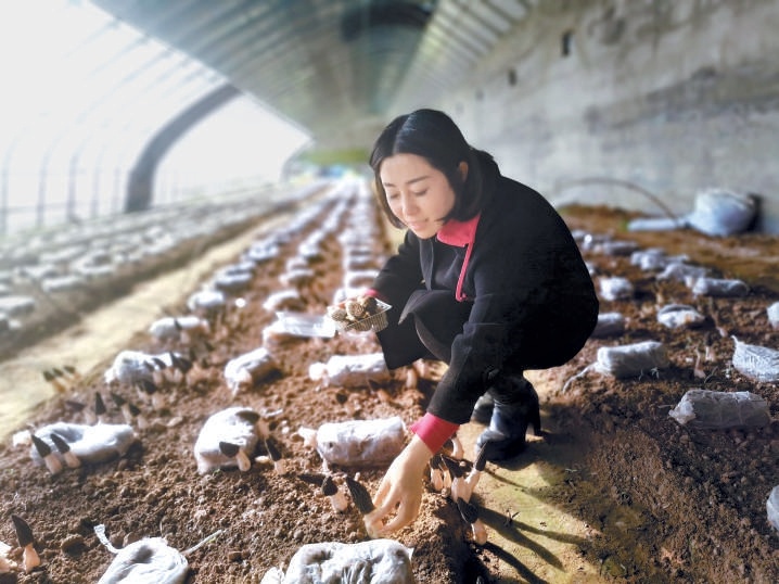 一頭利落的短發(fā),筆挺的身姿,明亮的笑容,39歲的董偉給人的第一印象有點(diǎn)颯。跟隨她來到位于懷柔區(qū)廟城鎮(zhèn)王史山村的溫室大棚,只見一個個小傘般的蘑菇頂蓋從土中鉆出來,看上去皺皺巴巴,筆直的菌柄呈象牙白色,村民們手持特制的小彎刀,嫻熟地將蘑菇從根部割下,不一會兒就裝滿了一筐?!斑@是羊肚菌,一種珍稀食用菌,聞起來有一股淡淡的香味?!闭f起蘑菇種植,董偉如數(shù)家珍,“羊肚菌是低溫菇,溫度一上來就不行了,收獲已經(jīng)接近尾聲?!?/p>