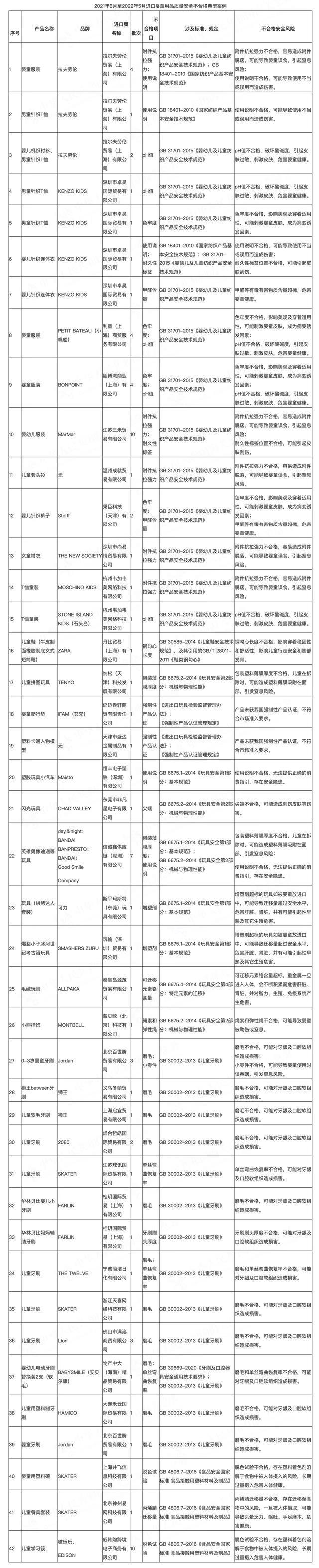 央廣網北京6月1日消息 據海關總署網站消息,6月1日,海關總署通報2021年6月至2022年5月間檢出的部分進口嬰童用品質量安全不合格典型案例,包括服裝、童鞋、玩具、牙刷、食品接觸產品等5類82批次進口嬰童用品,涉及拉夫勞倫、KENZO KIDS、ZARA和獅王等多個品牌產品。