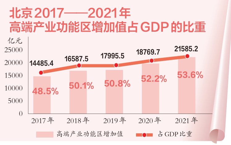 重點功能區呈現集聚效應。中關村國家自主創新示范區等高端產業功能區占據全市經濟總量的半壁江山,2021年實現增加值2.2萬億元,占全市GDP的53.6%,比2016年提高5.3個百分點。