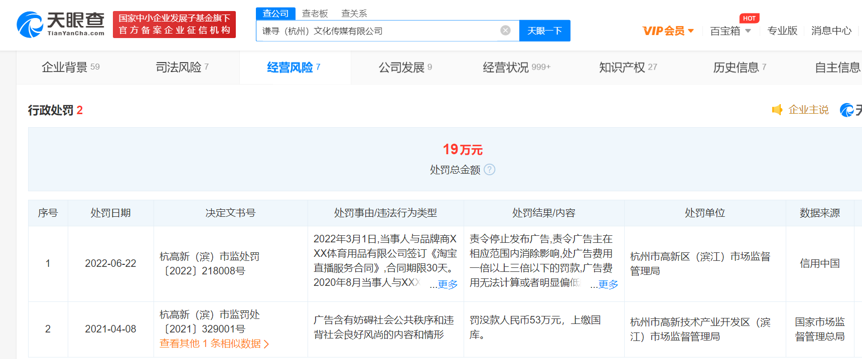 央廣網北京6月27日消息(記者 楊柳青) 近日,謙尋(杭州)文化傳媒有限公司因違反廣告法,被杭州市高新區(濱江)市場監督管理局罰款19萬元。