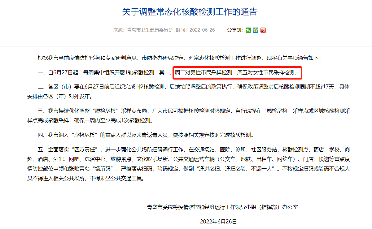 同時,青島市衛健委強調,“男女分開檢測”是基本原則,不是截然分開。若有特殊情況,各采樣點同樣會提供服務。另“男女分開檢測”主要用于社區集中組織,其他時間和需求,市民可以通過常態化開放的“愿檢盡檢”采樣點完成采樣,因此新政策不會給市民帶來不便。無論您在哪里采樣,一定要記得一周至少檢測一次。