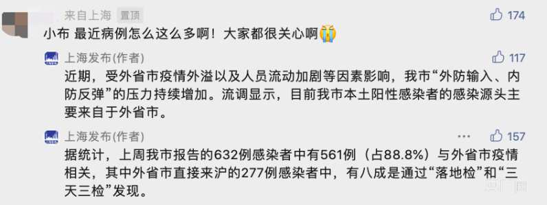 上周上海報告的632例陽性感染者中有561例(占88.8%)與外省市疫情相關(央廣網發 截自:上海發布微信公眾號)