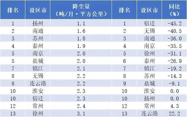據介紹,為進一步推進全省環境空氣質量改善,按期保質完成年度大氣污染防治攻堅目標任務,江蘇省生態環境廳每月對13個設區市降塵量進行排名。