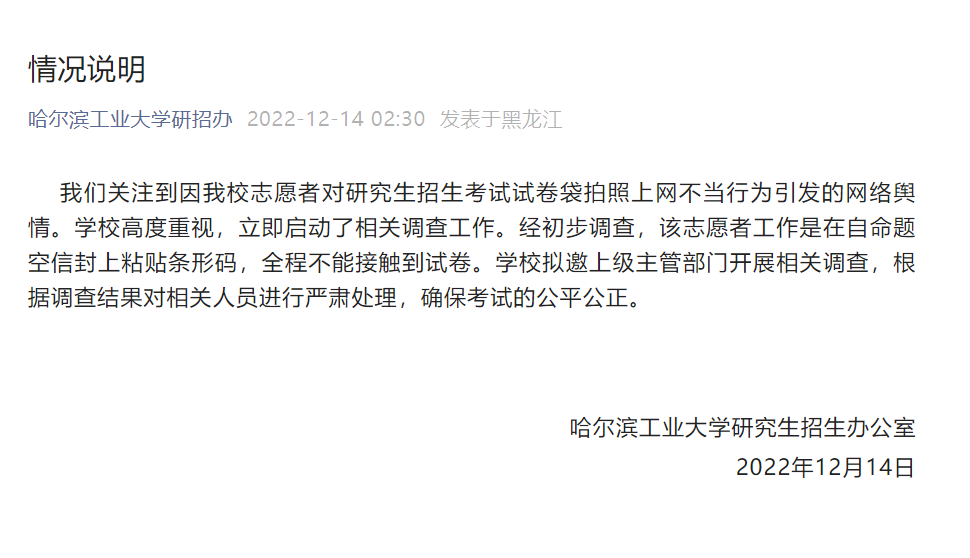 央廣網哈爾濱12月14日消息(記者馬俊瑋)12月14日,哈爾濱工業大學研究生招生辦公室通報:我們關注到因我校志愿者對研究生招生考試試卷袋拍照上網不當行為引發的網絡輿情。學校高度重視,立即啟動了相關調查工作。經初步調查,該志愿者工作是在自命題空信封上粘貼條形碼,全程不能接觸到試卷。學校擬邀上級主管部門開展相關調查,根據調查結果對相關人員進行嚴肅處理,確??荚嚨墓焦?。