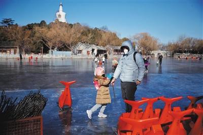 北海公園自古就有“冬宮”之美稱,據史料記載,北海歷史上有“冰嬉之制”,慈禧太后曾在冬季到北海觀看冰嬉表演,光緒帝曾在北海太液池上乘坐冰橇。記者29日在南門荷花湖看到,湖面冰層凍得厚實,冰場剛一開門,不少游客已經迫不及待入場,在冰面上玩起了冰車。