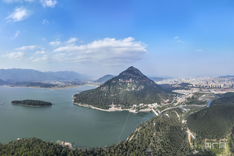 冬日暖陽下,綠意盎然、湖水環抱的石竹山(央廣網發 謝貴明 攝)