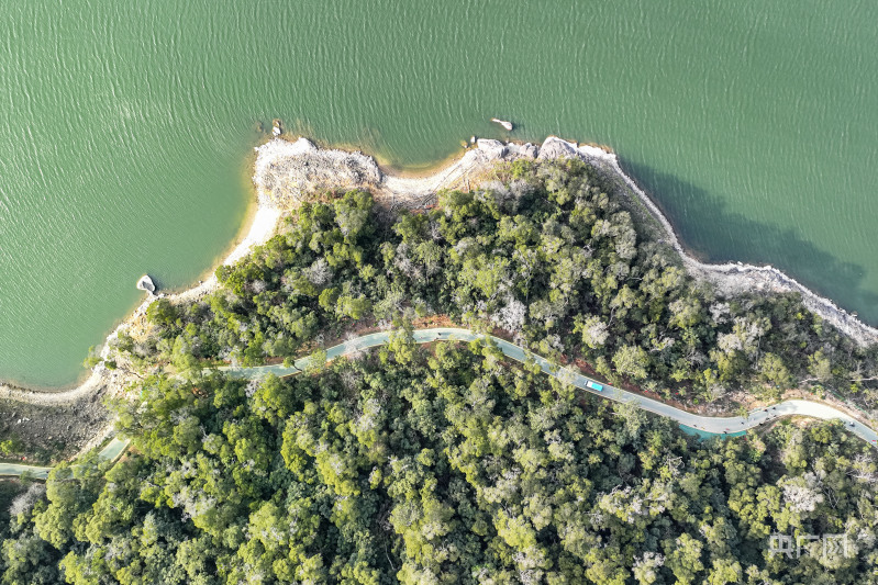 福建省福清市石竹山景區內的東張水庫,綠樹、湖水、小島交相輝映,呈現一片綠意盎然的冬季美景(央廣網發 謝貴明 攝)