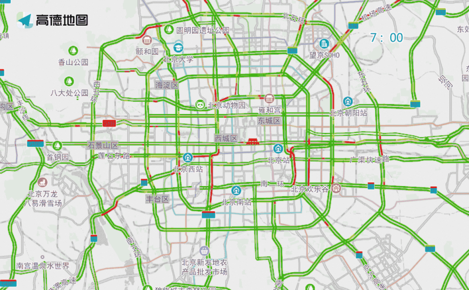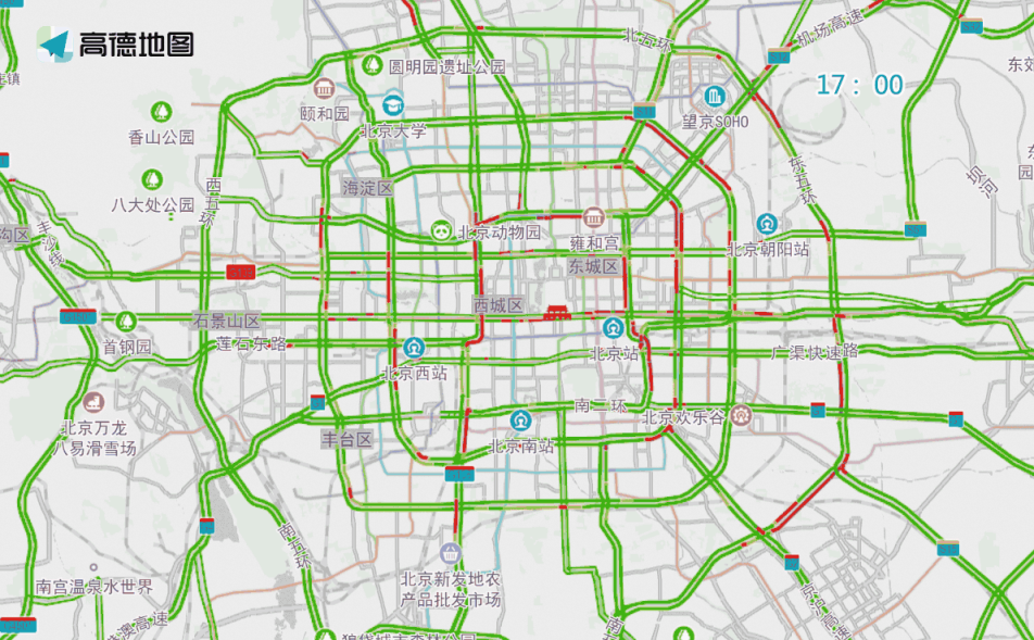 晚高峰期間,東、西、北二、三、四、五環(huán),東六環(huán)部分路段,以及萬泉河路至圓明園西路、通惠河北路、蓮石東路等城區(qū)道路出城方向車流集中,京藏高速、京承高速、京通快速、京港澳高速、機(jī)場(chǎng)高速等高速公路出京方向?qū)⒊霈F(xiàn)高峰車流,高峰時(shí)段為17:00—19:00,周五晚高峰提前且持續(xù)時(shí)間較長(zhǎng)。
