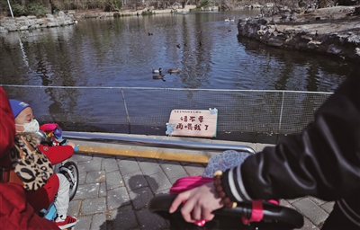 3月16日,北京動物園,水禽湖邊多處設置了請勿投喂提示牌。