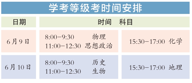 今年統一高考考試科目為語文、數學、外語3門,滿分均為150分。其中,英語聽說考試滿分50分,其他外語(非英語)聽力考試滿分30分,兩次聽說(聽力)考試的最高成績與其他部分試題成績一同組成外語科目成績計入高考總分。學考等級考科目為思想政治、歷史、地理、物理、化學、生物6門,由考生自主選擇3門參加考試,每科目滿分100分。參加本科招生錄取的考生總成績由3門統一高考成績和考生選考的3門學考等級考成績構成,總成績滿分值為750分。