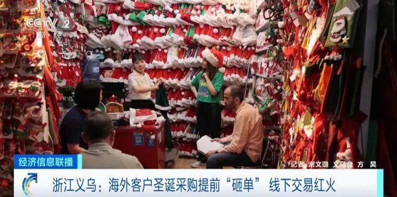 在義烏國際商貿城一區的攤位里,幾位來自黎巴嫩的采購商正在選購圣誕衣和圣誕帽。選品、談價、成交, 不到十分鐘,他們就簽下了一筆200萬元的訂單 。他們告訴記者,上一次來義烏還是2019年,此后一直在線上交易,今年可以重回線下采購,他們就提前啟程,并且擴大了采購規模。