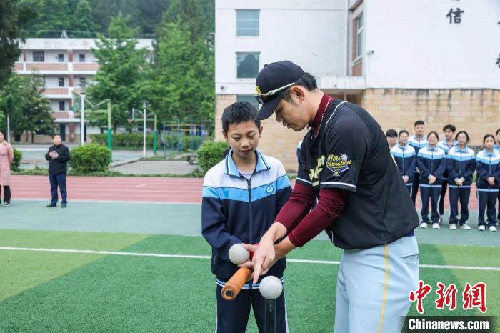 今年4月,臺青宋奇軒在北京合伙創(chuàng)辦“新世代棒球俱樂部”。圖為宋奇軒在四川省青川縣為當?shù)貙W(xué)校開展公益棒球課項目。(受訪者供圖)