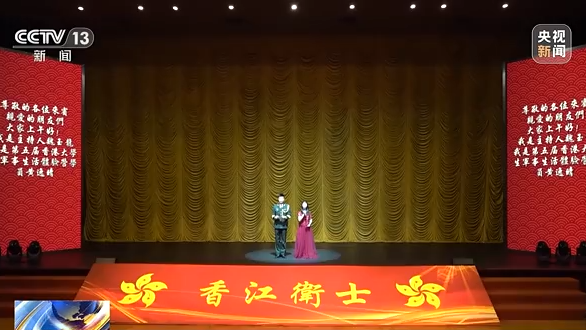 《香江衛士》主題文藝演出舞臺上,身著紅色禮服的香港女孩黃逸晴與駐軍官兵同臺主持。黃逸晴是2015年香港大學生軍事生活體驗營的學員,大學畢業后,她經常從事社會公益工作,把愛國精神、奉獻情懷傳遞給更多人。