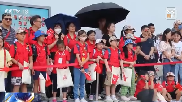 上午10時,在昂船洲軍營,駐香港部隊三軍儀仗隊邁著鏗鏘有力的步伐護旗而出,伴隨著雄壯的《義勇軍進行曲》,青少年們與解放軍官兵一起升國旗、唱國歌。在隨后的軍事課目表演中,突降大雨,官兵們頂著暴雨為現場觀眾展示了軍樂隊列、格斗技術、刺殺操、獵人戰斗等課目。