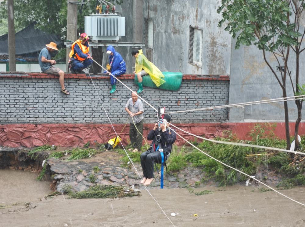 現(xiàn)場,水已經(jīng)漫過被困人員所處的房屋屋頂,5名群眾被困在高處的墻頭,其中還有1名兒童。消防救援人員到場后,迅速利用繩索搭建救援通道。15分鐘后,繩橋架設(shè)完畢,消防救援人員對(duì)被困群眾展開救援。14時(shí)10分左右,救援任務(wù)成功完成,被困群眾均被轉(zhuǎn)移到安全地點(diǎn)。