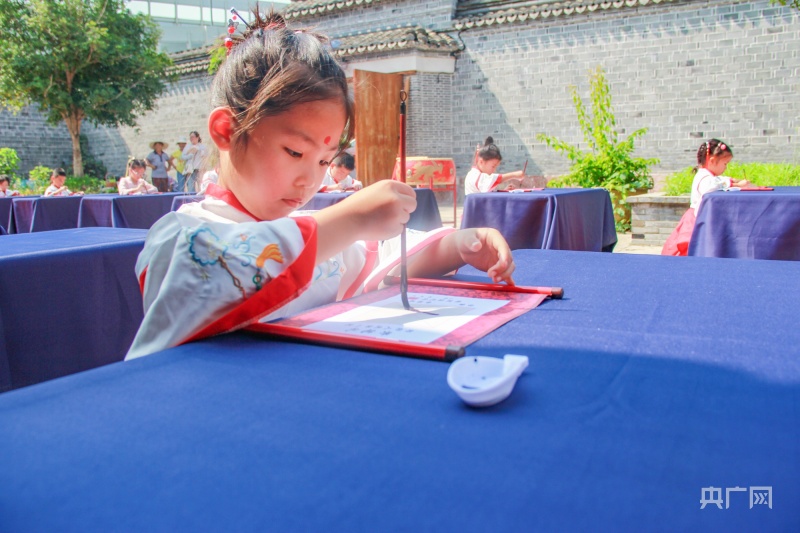央廣網(wǎng)寧波8月22日消息(記者 張雯雯 通訊員 方舟 安雨晨)樹影婆娑,古韻悠揚(yáng),鼓聲清越,翰墨飄香。8月22日,在新學(xué)年來臨之際,寧波市江北區(qū)莊橋街道馬徑村文化禮堂舉行了一場別開生面的“開筆啟智慧 閱讀潤人生”開筆禮。活動(dòng)在茂昌房舉行,20多名即將上小學(xué)的小朋友身著漢服,在開筆儀式中感受中國傳統(tǒng)文化的魅力。