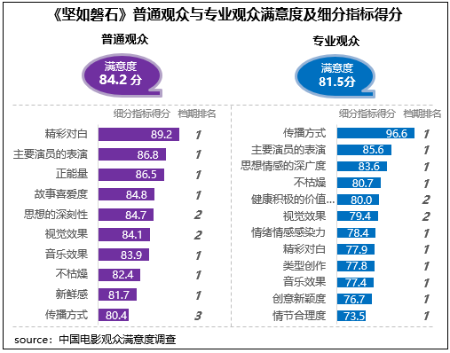 張藝謀導演新作《堅如磐石》獲得觀眾滿意度評分84.1分,居2023年國慶檔調查五部影片首位,作為聚焦反腐反黑的警匪題材影片,對于社會現實以及人性的描摹深度和豐富層次得到了觀眾的高度好評,思想性得分85.4分,為三大指數中最高,觀賞性得分84.4分,為檔期最高分,其中主要演員的表演得到了不同觀眾的高度評價,在2023年調查的50部影片中分別居普通觀眾評價的第6位和專業觀眾評價的第3位。