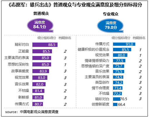 陳凱歌執導的抗美援朝題材影片《志愿軍:雄兵出擊》觀眾滿意度83.8分,影片主題立意與國慶氛圍貼合,思想性得分85.0分,影片全景式呈現抗美援朝歷史,所傳遞的愛國精神和英雄氣概震撼人心,有85%的受訪觀眾表示在觀賞影片后感動不已。