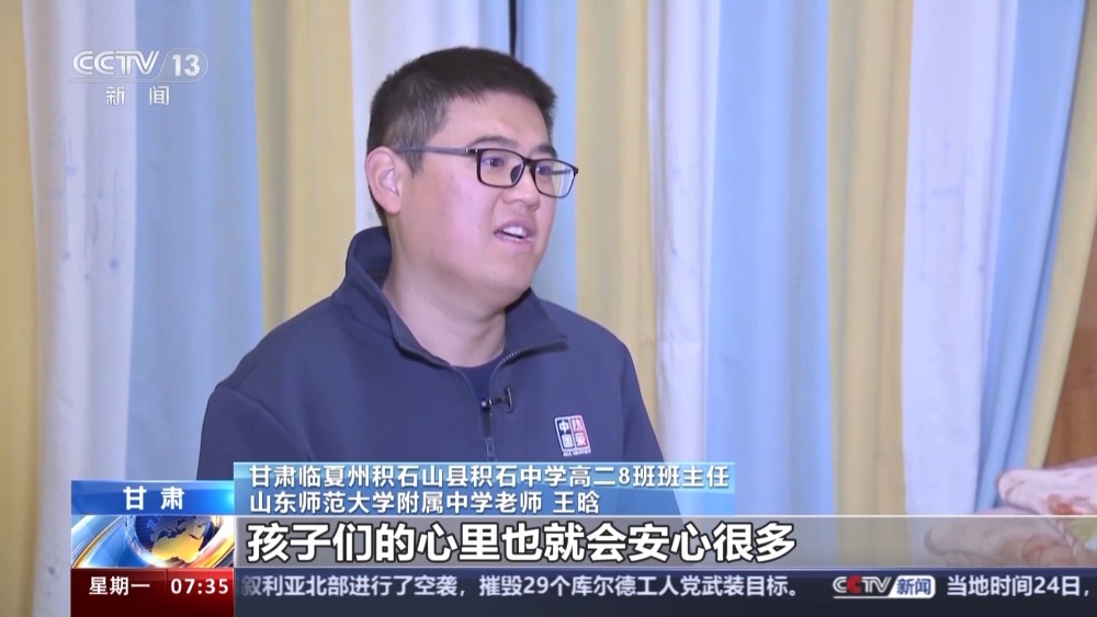 甘肅臨夏州積石山縣積石中學高二8班班主任、山東師范大學附屬中學老師 王晗:當時著急的時候也沒有穿襪子,也沒有穿褲子,就穿了一條秋褲就出去了,就抓緊往學校跑,大約是15分鐘后我們就趕到了學校。在學生心目中,班主任在和班主任不在絕對是兩個樣,我往那一站,孩子們的心里也就會安心很多。當然了孩子們都在,我心里也安心得多。