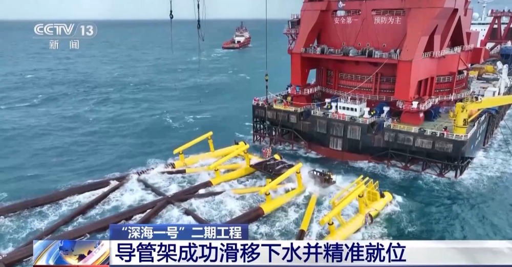 中國海油“深海一號”二期工程導管架海上安裝首席 黎世龍:“深海一號”二期工程導管架海上安裝采用滑移下水方式進行。這種方式是利用導管架自身重力并配合液壓千斤頂助推,使導管架從駁船平穩地滑入海中,再通過起重船將導管架吊裝扶正坐底,從而實現安裝就位。