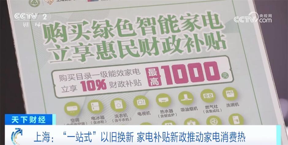 央視網消息:日前,國務院印發《推動大規模設備更新和消費品以舊換新行動方案》,明確實施消費品以舊換新行動。上海市從3月30日起實施新一輪綠色智能家電消費補貼政策,對16大類一級能效家電產品進行補貼,各大商超賣場也推出“一站式”以舊換新、延伸局部改造等補貼及服務。