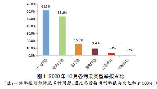 從污染類型來看,10月大氣污染舉報最多,占舉報總量的61.5%,該占比比9月同類占比減少1.5%。其次為噪聲污染舉報,占舉報總量的53.3%。水污染、固廢污染、生態破壞和輻射污染舉報分別占舉報總量的15.5%、9.4%、3.4%和0.7%。