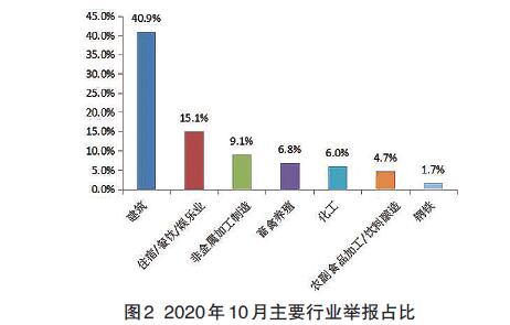 從行業類型來看,10月公眾反映最集中的行業為建筑業,占40.9%;其次為住宿餐飲娛樂業和非金屬加工制造業,分別占15.1%和9.1%。其中,建筑業占比比9月同類占比增加1.8%;非金屬加工制造業舉報占比比9月同類占比增加2.1%;住宿餐飲娛樂業舉報占比比9月同類占比減少0.3%,化工行業舉報占比比9月同類占比減少2.6%。