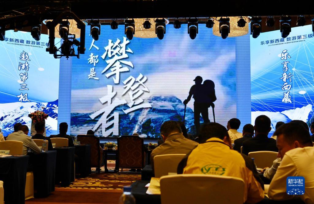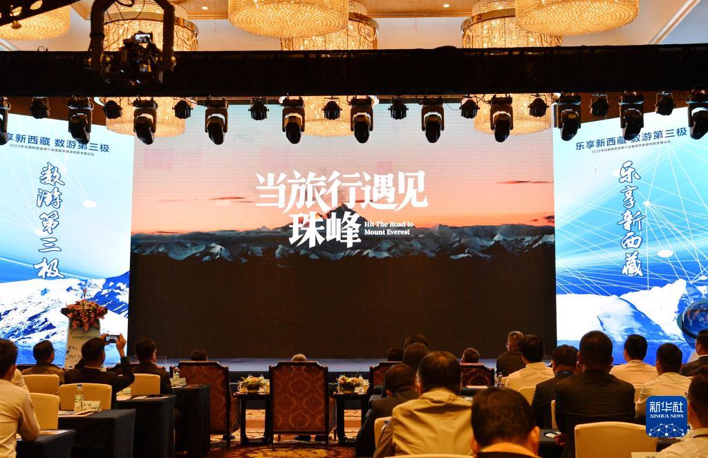 在2022年西藏日喀則旅游推介會暨數字旅游創新發展論壇上,播放“我想去珠峰”本地人采訪短片(7月15日攝)。新華社記者 張汝鋒 攝