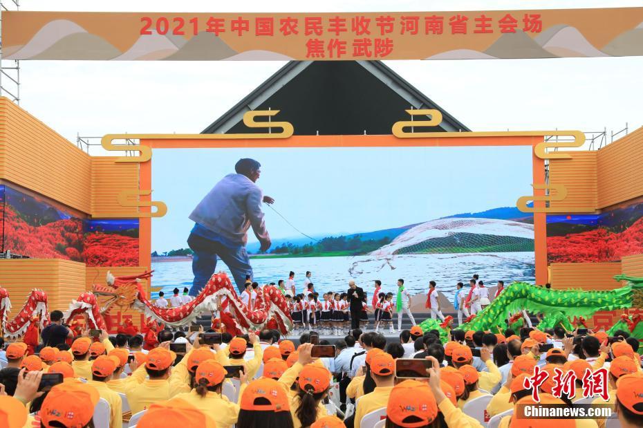 9月23日,2021中國農(nóng)民豐收節(jié)河南省主會場在焦作市武陟縣嘉應(yīng)觀啟幕。活動現(xiàn)場,隨處可見“豐收”符號,各類農(nóng)副產(chǎn)品琳瑯滿目,船上漁民捧著魚喜笑顏開。圖為河南省主會場。闞力 攝