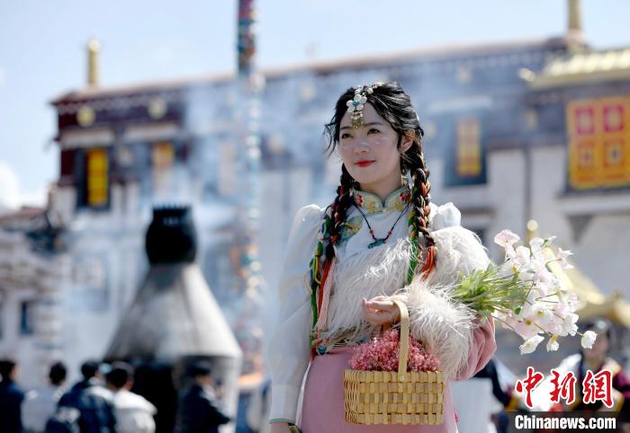 4月17日,游客身著藏式元素服裝在拉薩大昭寺廣場拍照留念?!±盍帧z