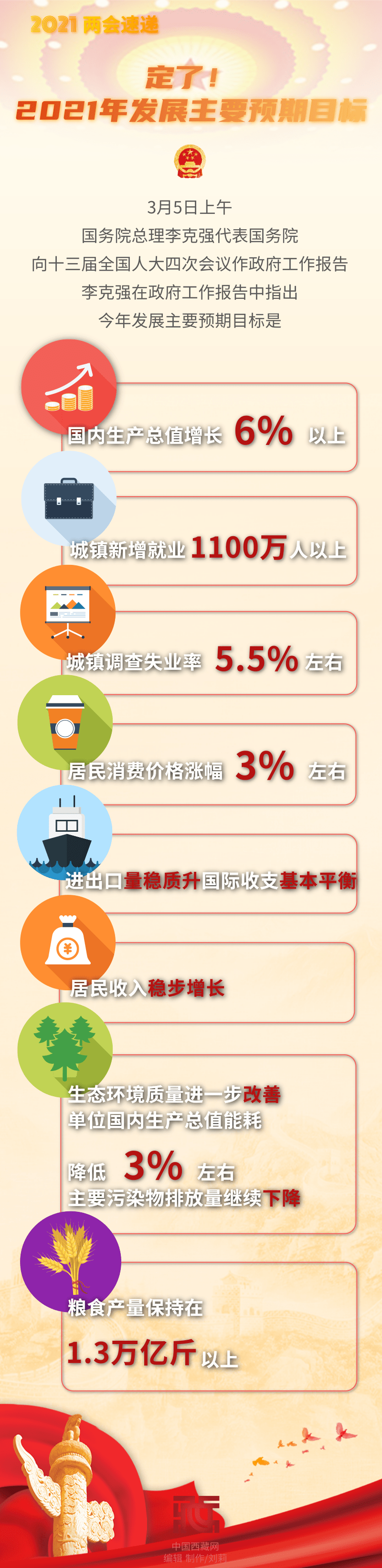 李克強在政府工作報告中指出,今年發展主要預期目標是:國內生產總值增長6%以上;城鎮新增就業1100萬人以上,城鎮調查失業率5.5%左右;居民消費價格漲幅3%左右;進出口量穩質升,國際收支基本平衡;居民收入穩步增長;生態環境質量進一步改善,單位國內生產總值能耗降低3%左右,主要污染物排放量繼續下降;糧食產量保持在1.3萬億斤以上。(中國西藏網 編輯、制作/劉莉)