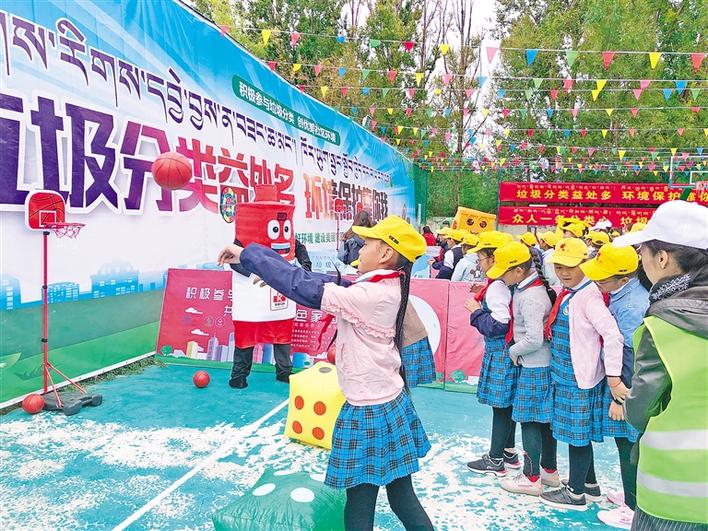 在拉薩市城關(guān)區(qū)組織開展的“不忘初心、牢記使命”主題教育暨“垃圾分類黨員先行 守護(hù)凈土人人有責(zé)”活動(dòng)現(xiàn)場,學(xué)生代表參加趣味游戲。