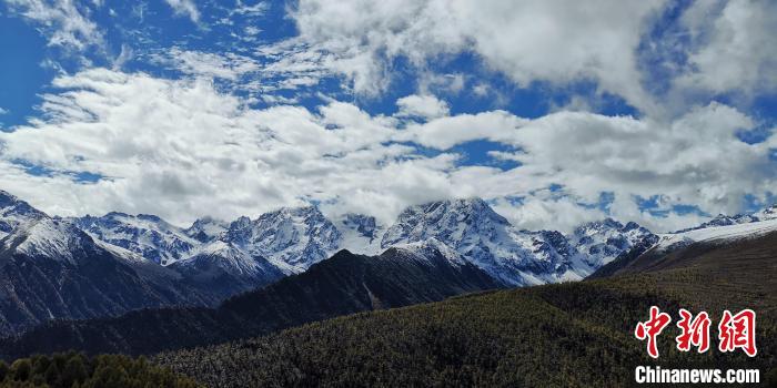 圖為銀白色白馬雪山與綠色植被勾勒生態(tài)畫卷。 張?zhí)砀!z