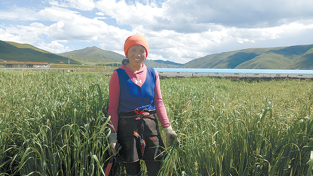 澤白是門堂鄉門堂村的貧困戶,家里有四口人,這些年,得益于草原補助、生態管護員等脫貧政策,澤白家于2016年脫貧。禁牧實施以來,澤白和丈夫種植了0.3公頃(五畝)草地早熟禾,當記者見到澤白時,她正在一片綠油油的田地間“揮舞”著鐮刀,身邊已有好幾摞割好的早熟禾。