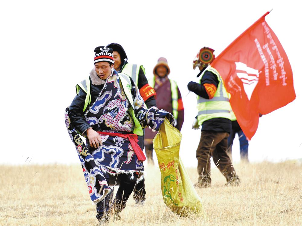 瑪多縣瑪查理鎮噶丹村,生態管護員索南吉(右)與才讓多杰在村子周邊的草原上撿垃圾。