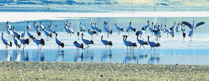 在冬日暖陽的照耀下,成群結隊的鳥兒在河面上、濕地里盡情嬉戲,赤麻鴨悠然戲水、斑頭雁低聲吟唱、黑頸鶴翩翩起舞……一派熱鬧的景象。