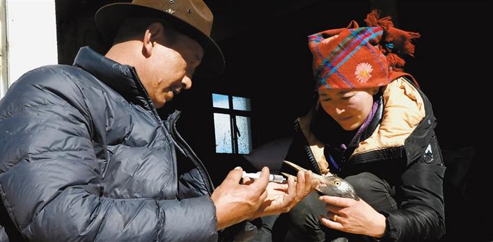 “你看,這只黑頸鶴是十幾天前我從田間救回來的,當時它的翅膀和右腿都受了傷,奄奄一息,我還擔心救不活它。我把消炎藥放入酥油中攪拌制成膏藥,涂抹在它的傷口上,并給它喂了口服消炎藥,白天就把它放到院子里,讓它鍛煉受傷的腿腳。通過細心照料它恢復得很好,等它痊愈了,我就把它放歸大自然。”49歲的巡護員多布杰高興地說。