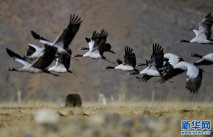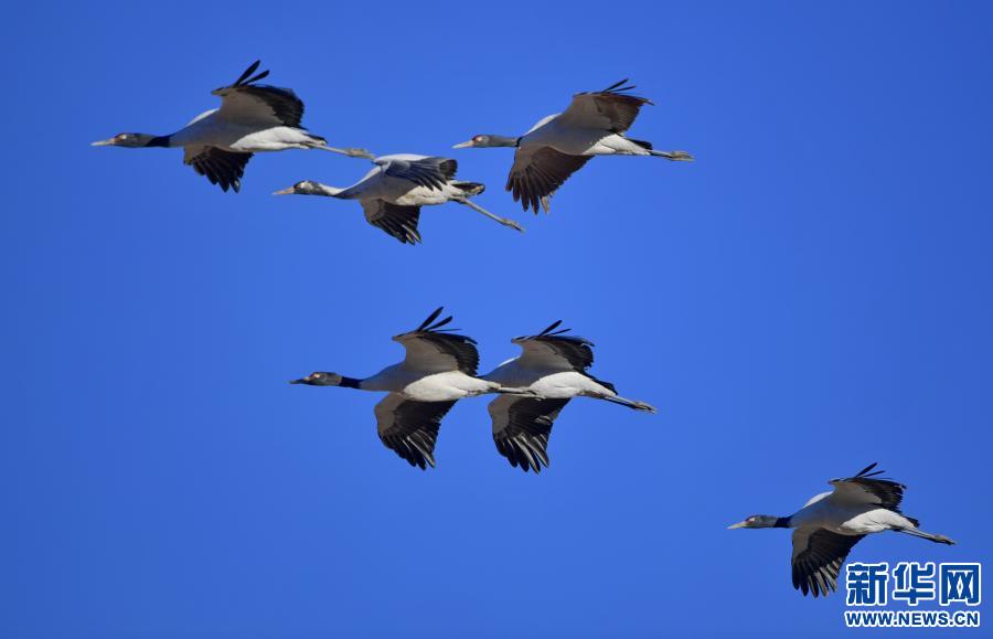 黑頸鶴在自然保護區里飛翔(2021年1月3日攝)。新華社記者 張汝鋒 攝