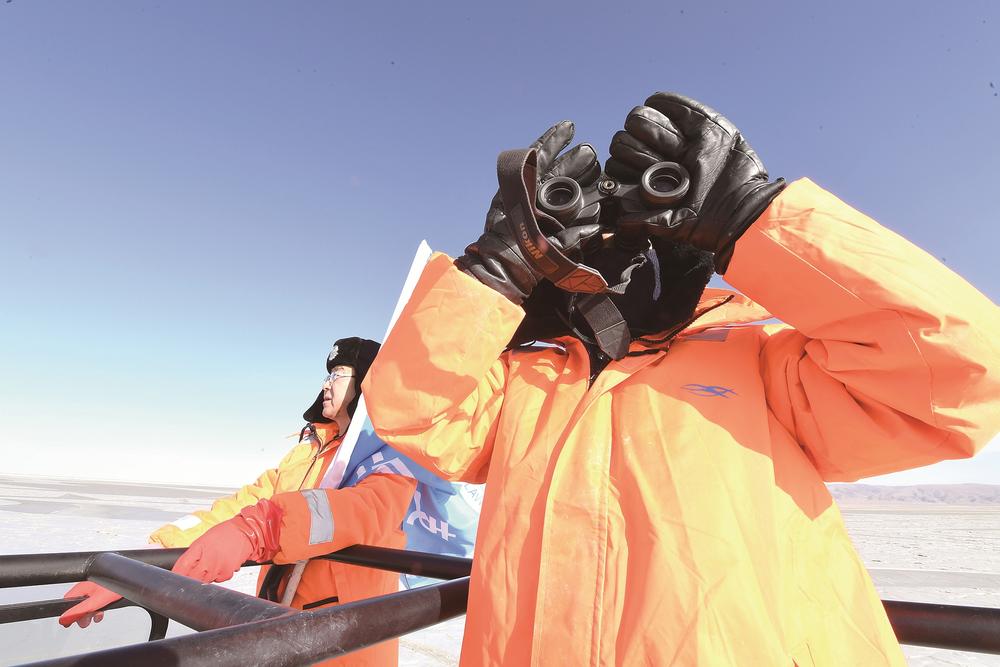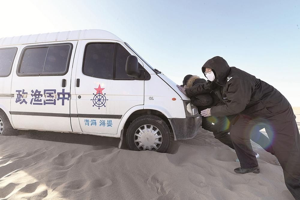 車緩緩駛向青海湖深處,即使穿得這么厚實,但寒風襲來時,巡湖隊員們依舊被凍得直哆嗦。