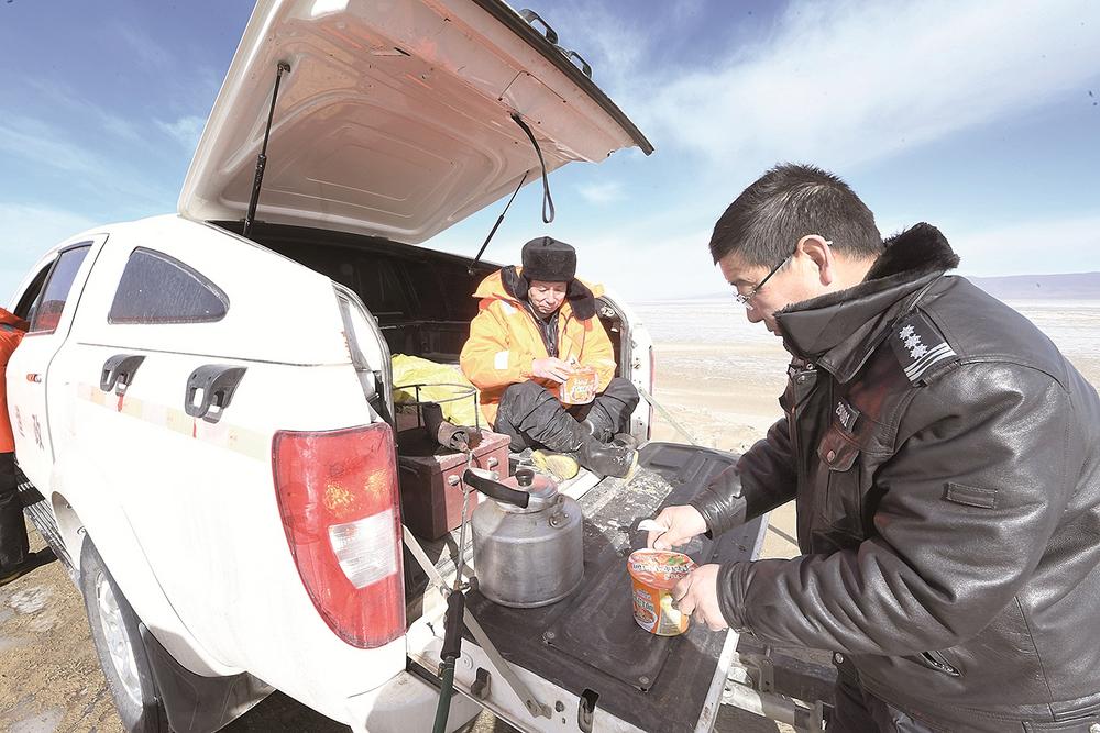 同事們前去巡查后不久,她們也開始忙碌起來,為隊員們準備“豐盛的午餐”——泡面。平常再簡單不過的燒開水,在寒風凜冽的青海湖邊卻異常艱難。