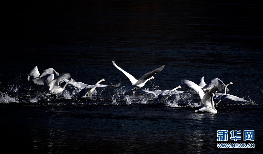 一群天鵝在位于青海省海南藏族自治州的千姿湖嬉戲。新華網 潘彬彬 攝