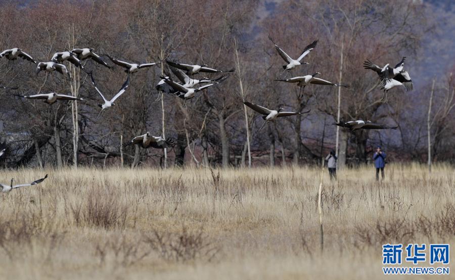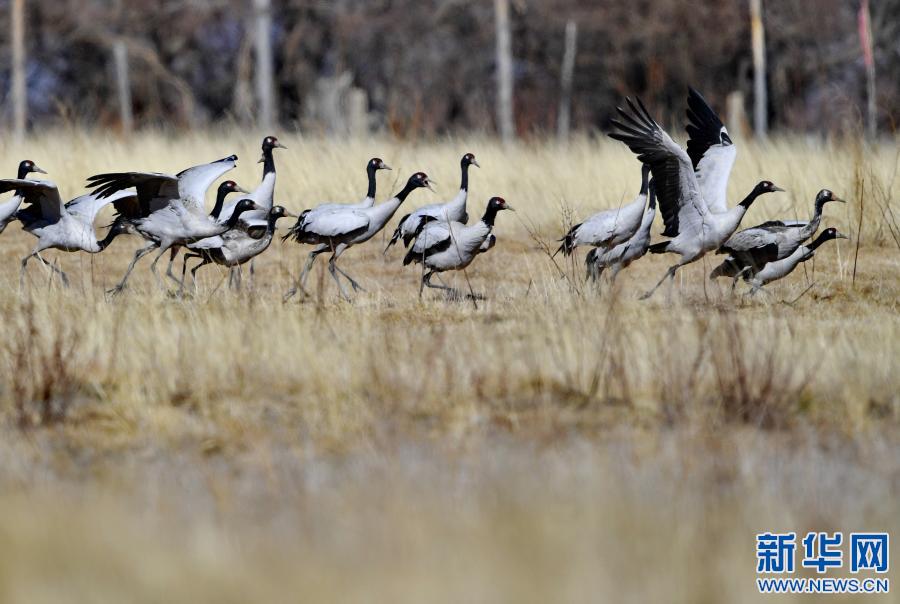 冬季,成群結(jié)隊的黑頸鶴遷徙到西藏林芝市,雅魯藏布江及江畔的農(nóng)田成了它們越冬的樂園。