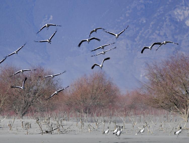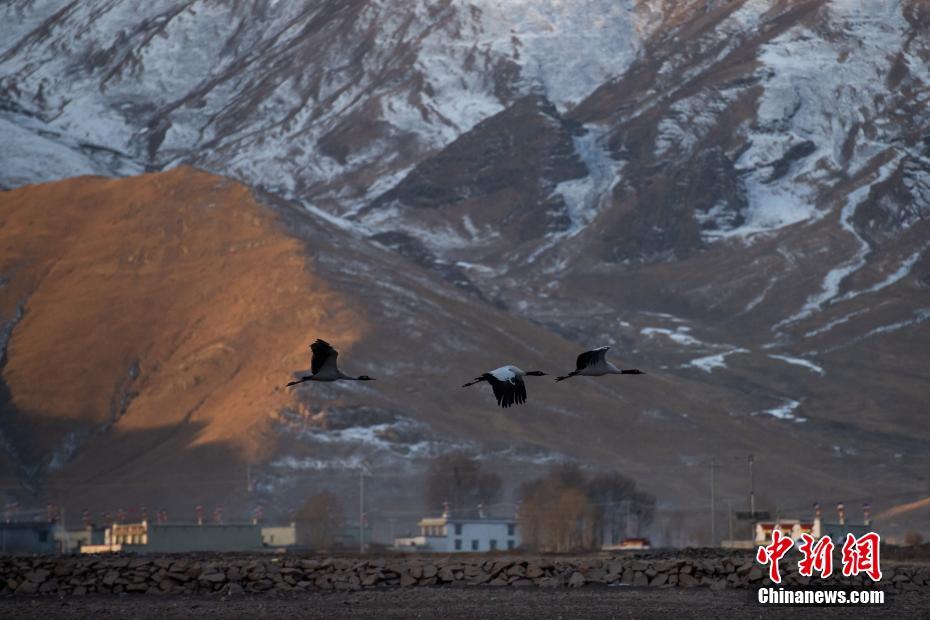 2月17日,西藏拉薩市林周縣黑頸鶴保護區內,黑頸鶴翩躚起舞、分外美麗。中新社記者 何蓬磊 攝