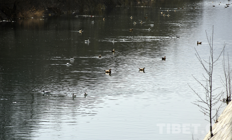 中國西藏網訊 波光粼粼的水面上,游弋著越冬水鳥,垂至水面的鵝黃柳葉正隨風搖擺。仲春時節的午后,西藏自治區拉薩市太陽島河北岸的河堤上三三兩兩的市民或走或停,欣賞著河景,享受著暖陽。