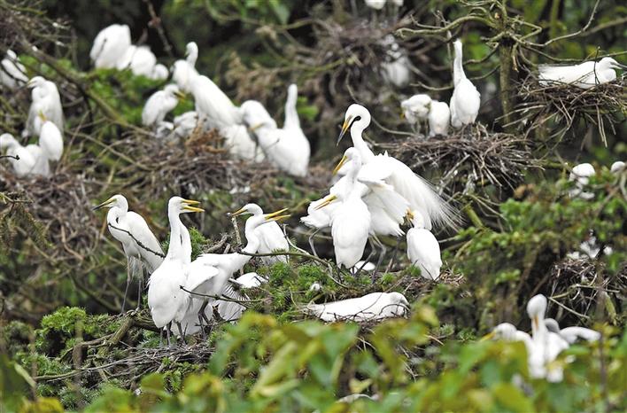 近期,在位于鄱陽湖畔的江西省南昌市新建區象山森林公園內,已安家筑巢的鷺鳥進入孵化哺育旺季。象山森林公園有著“鷺鳥王國”的美譽,每年都會吸引白鷺、蒼鷺、夜鷺等種類的鷺鳥飛抵棲息和繁衍后代。 白鷺在南昌市新建區象山森林公園內棲息(5月18日攝)。新華社記者 萬象 攝