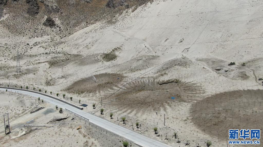 在山南市雅魯藏布江河谷地帶,村民們在維護固沙用的草方格(2019年7月14日攝)。新華社發(資料照片)