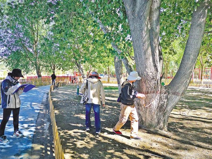 圖為西藏農牧學院的師生在測算貢覺林卡內古樹的相關數據。記者 扎西頓珠 攝