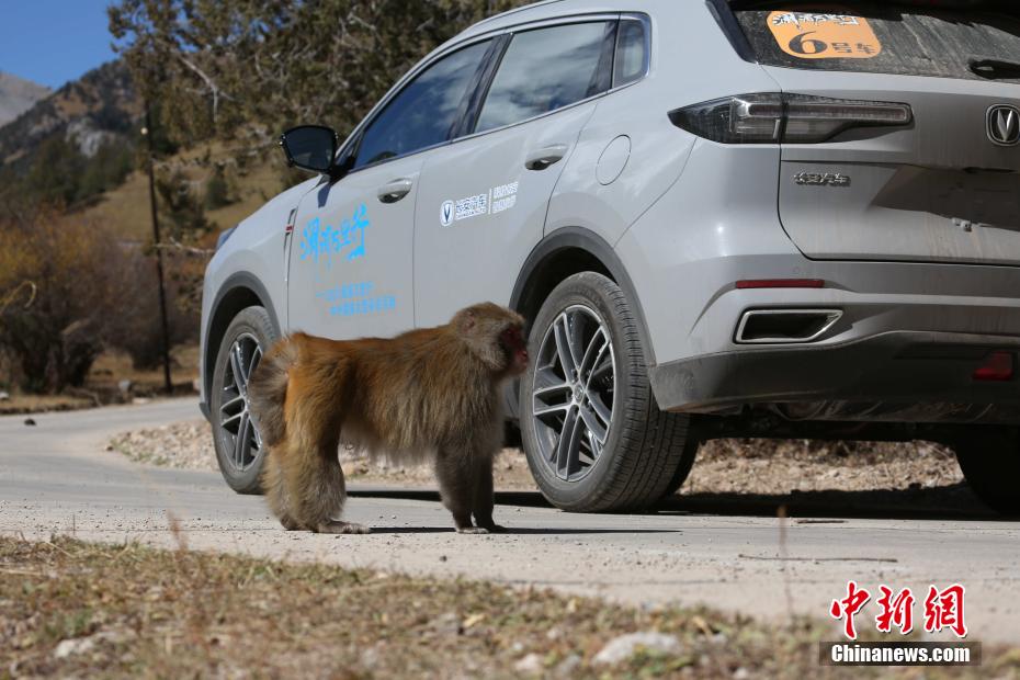 圖為一只藏獼猴近距離接觸2021瀾湄萬(wàn)里行活動(dòng)用車(chē)。張希紅 攝