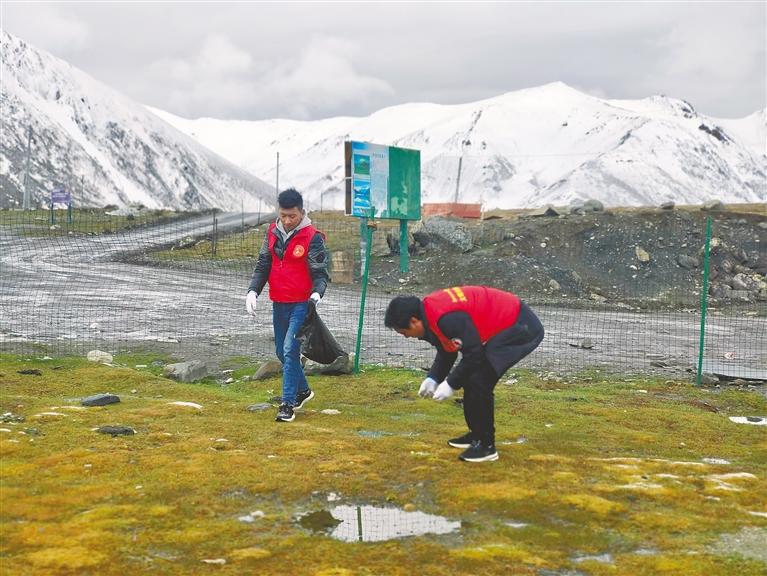 圖為該支部黨員在薩普雪山風景區撿拾垃圾。記者 萬靖 攝